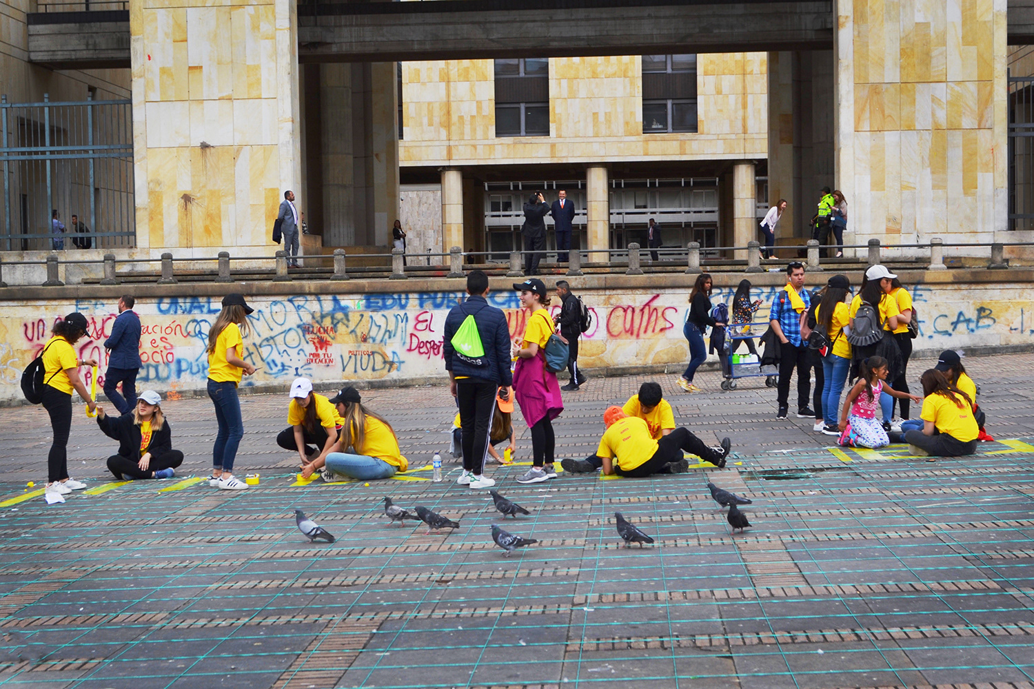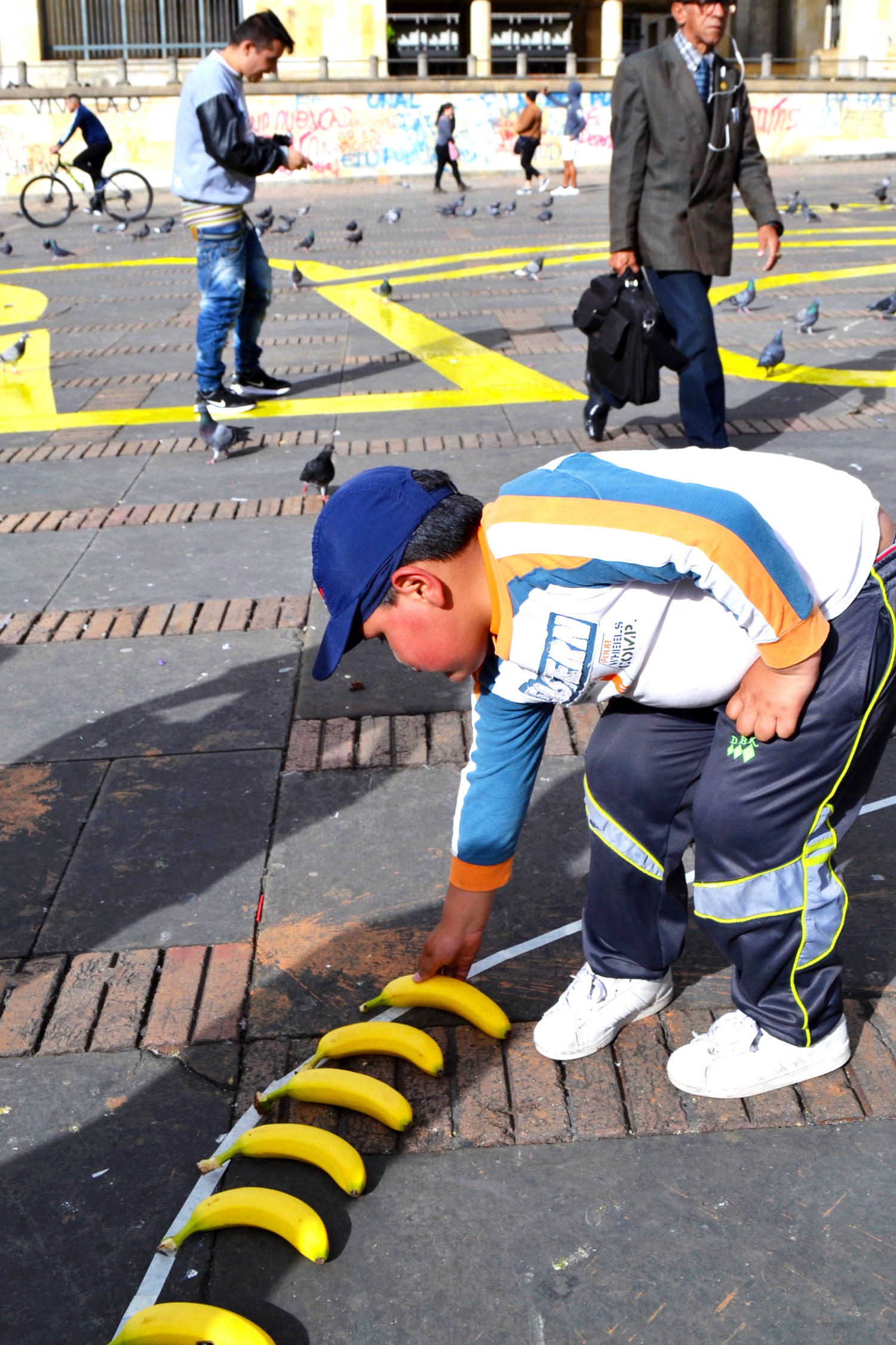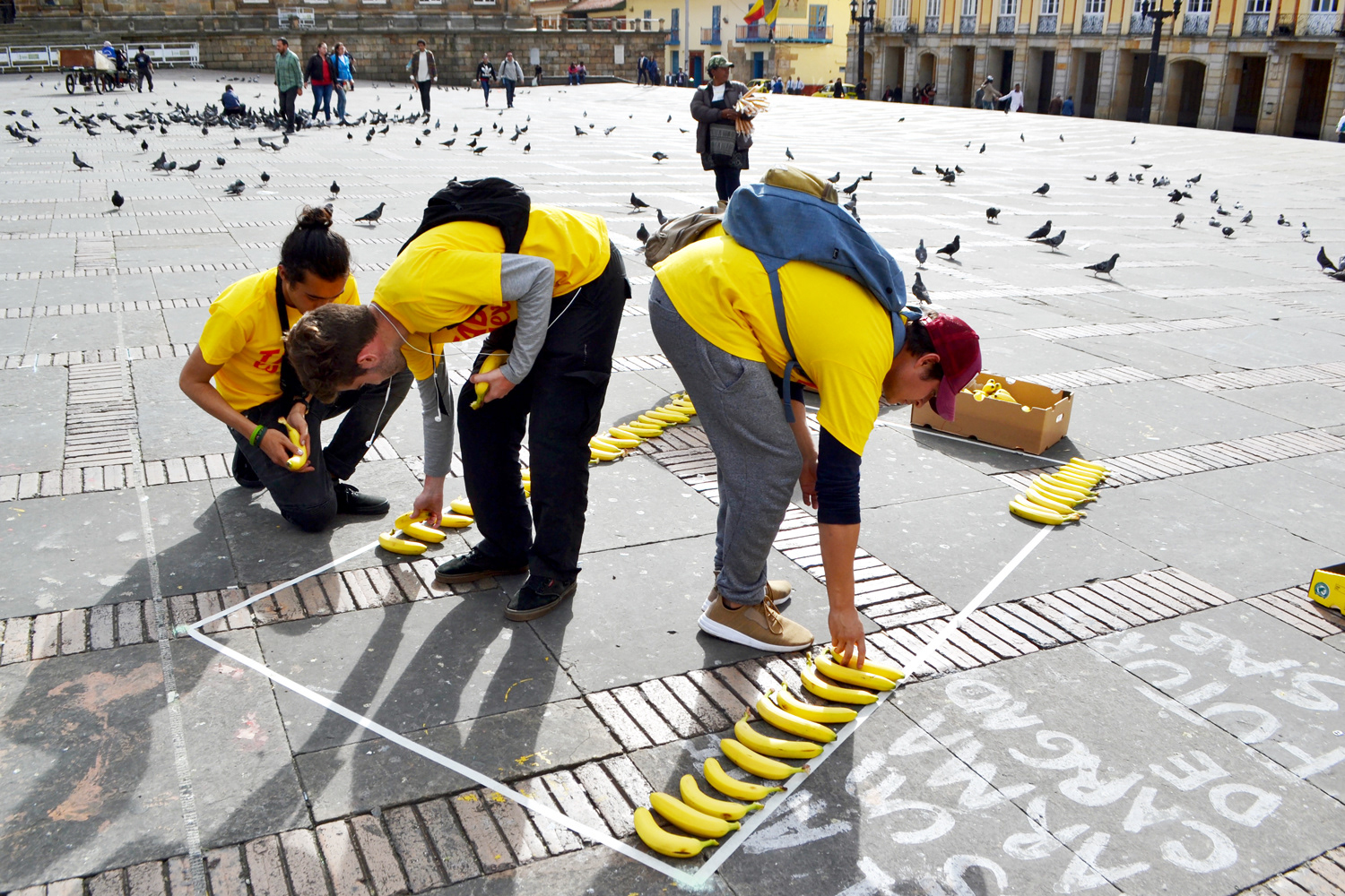 To achieve the greatest possible attention, we used 3200 bananas, 4000 meters of tape and 2000 condoms to carry out the typographic intervention in one of the most emblematic places in Bogotá: La Plaza de Bolívar.