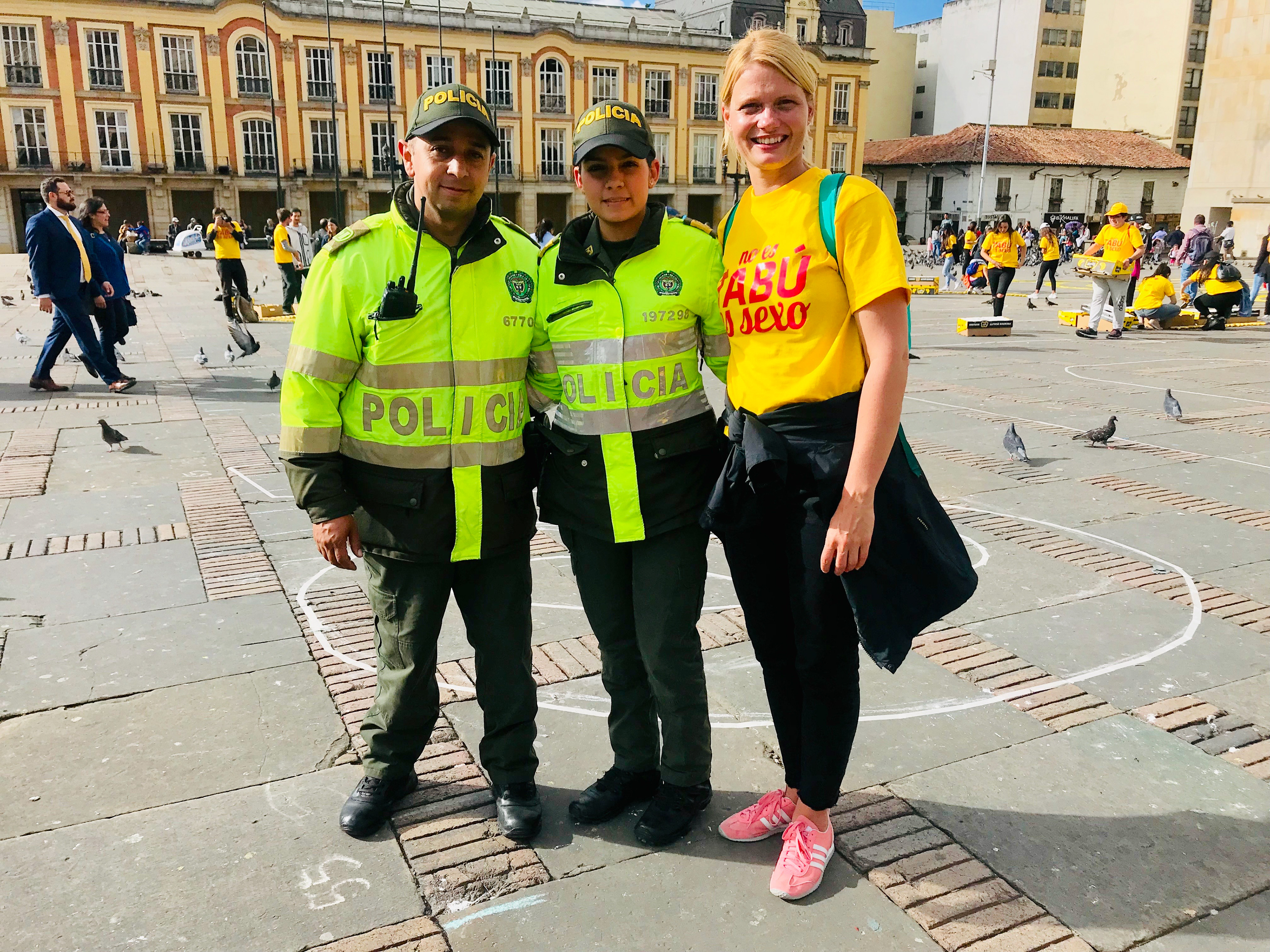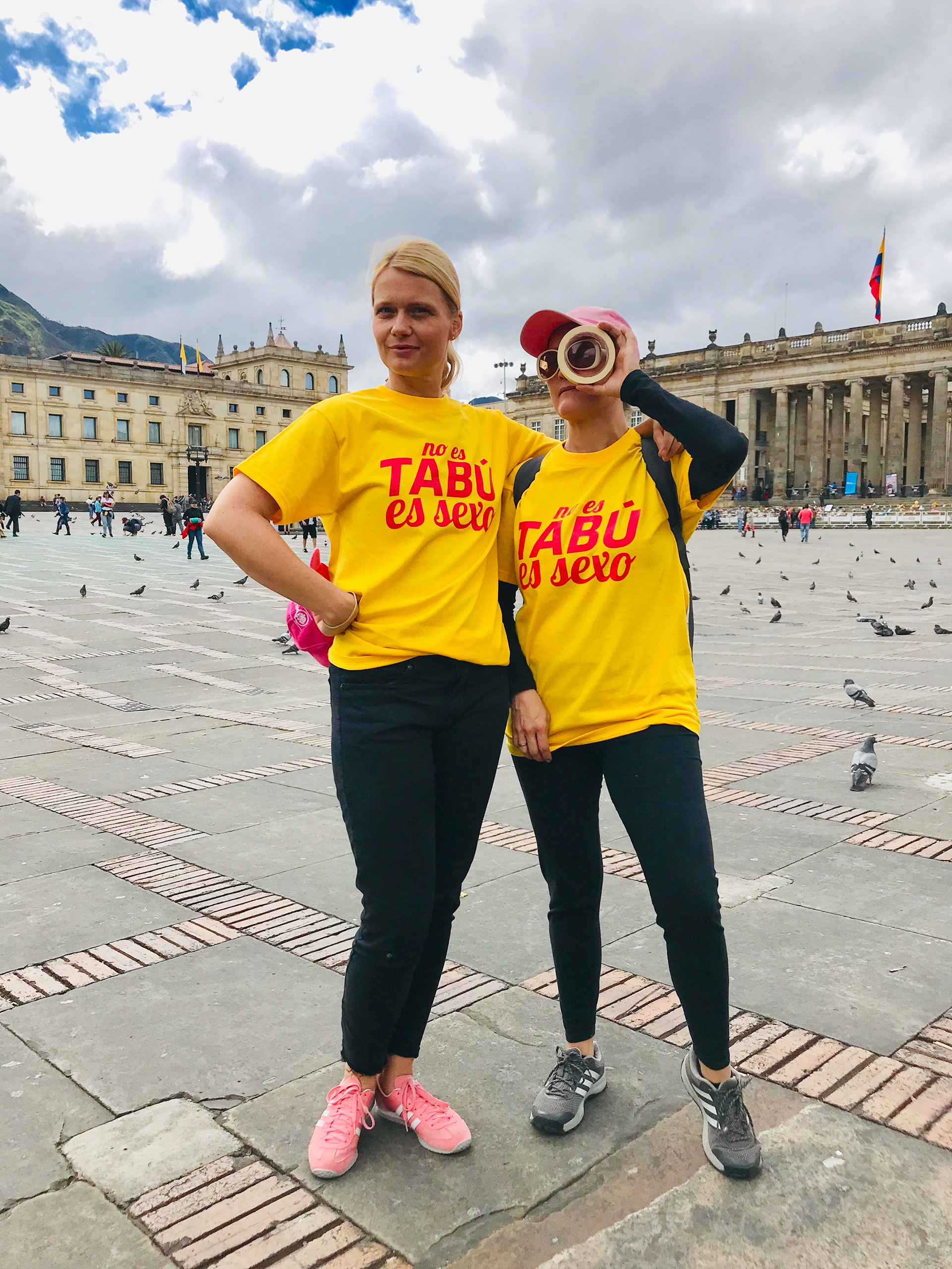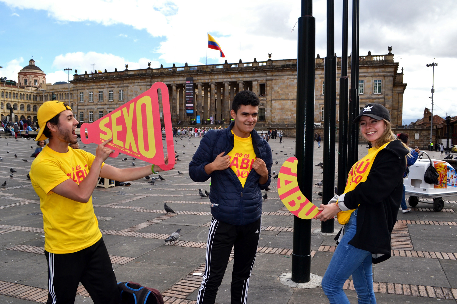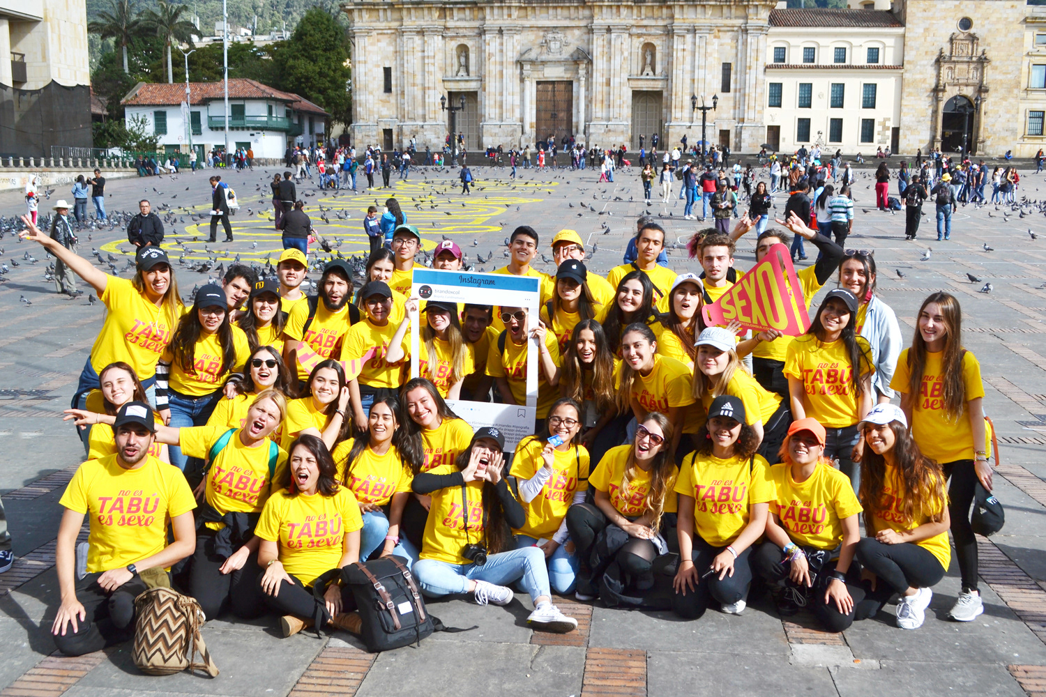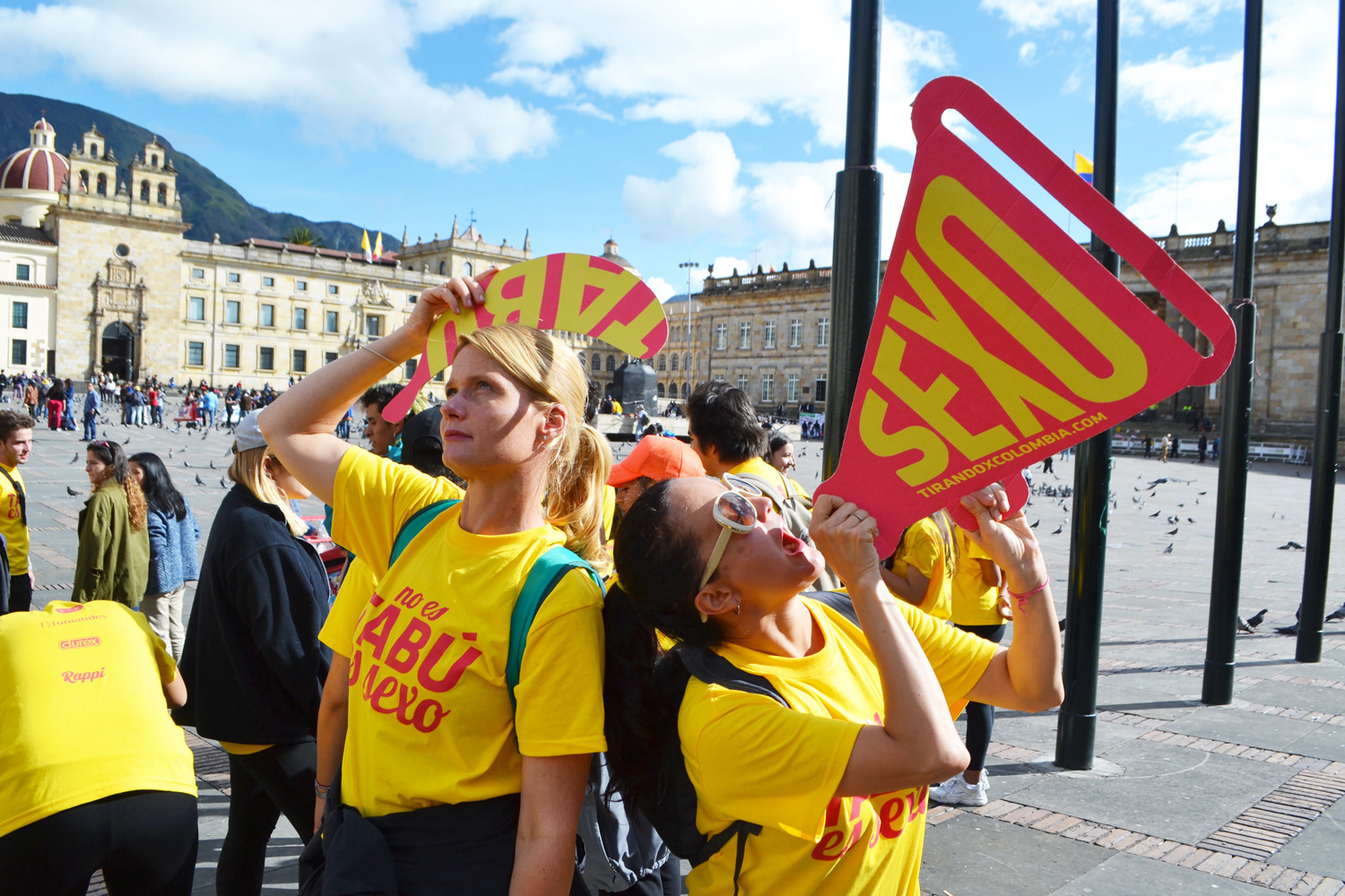 After more than 10 hours of hard work in the assembly and a very good behavior by passers-by in the Plaza de Bolívar in respecting our workspace, at 4 pm the final assembly of what was the interactive intervention was completed that involved everyone who was passing through the plaza. The end result was the words "It's not TABOO", using bananas and condoms, and the phrase "it's sex" made with yellow tape. The activity consisted in that when the signal was given, everyone who was passing through the Plaza de Bolívar and wanted to eat a banana or have a free condom, freely grab all the bananas and condoms they wanted, to literally eat the TABOO ( when the phrase “It is not TABOO” disappears) and the words “it is sex” are only left as an analogy that one must lose the taboo on sex and see it simply as something natural and pleasant. At the end of the day there were laughs, people playing, a lot of joy, but above all awareness about the problem of teenage pregnancy